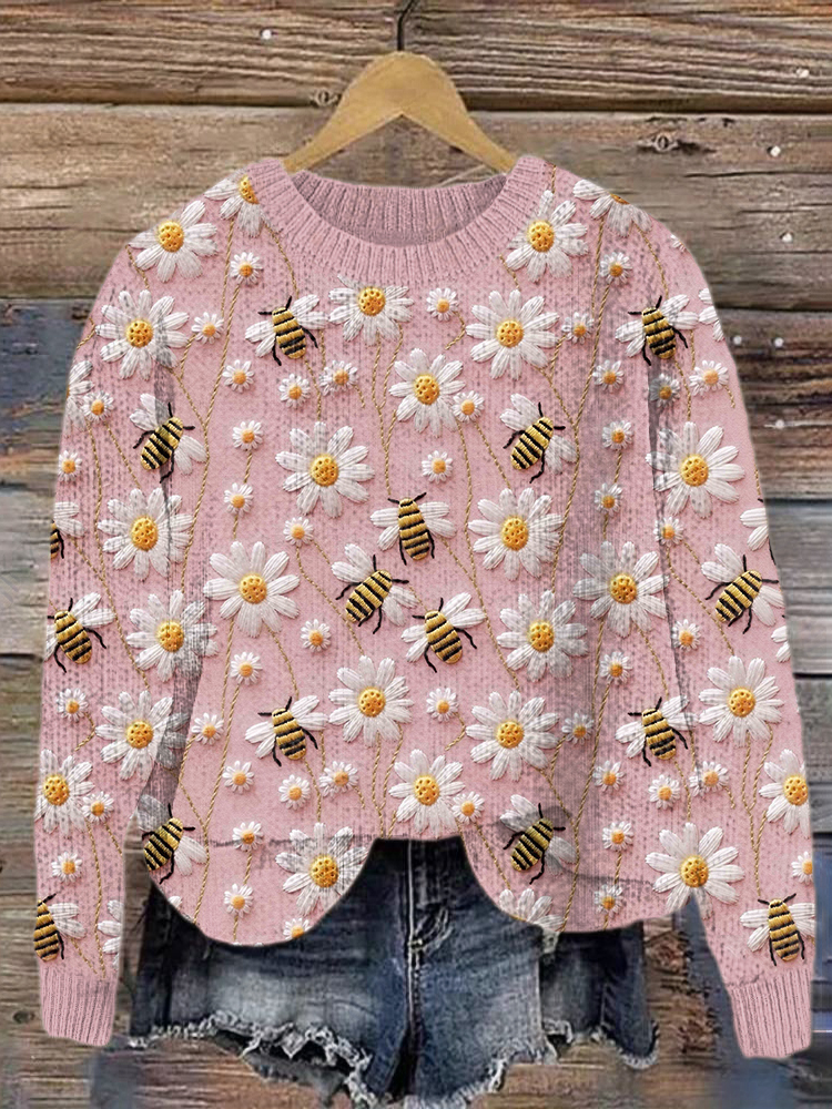 Bee & Daisy Embroidery Art Cozy Knit Sweater