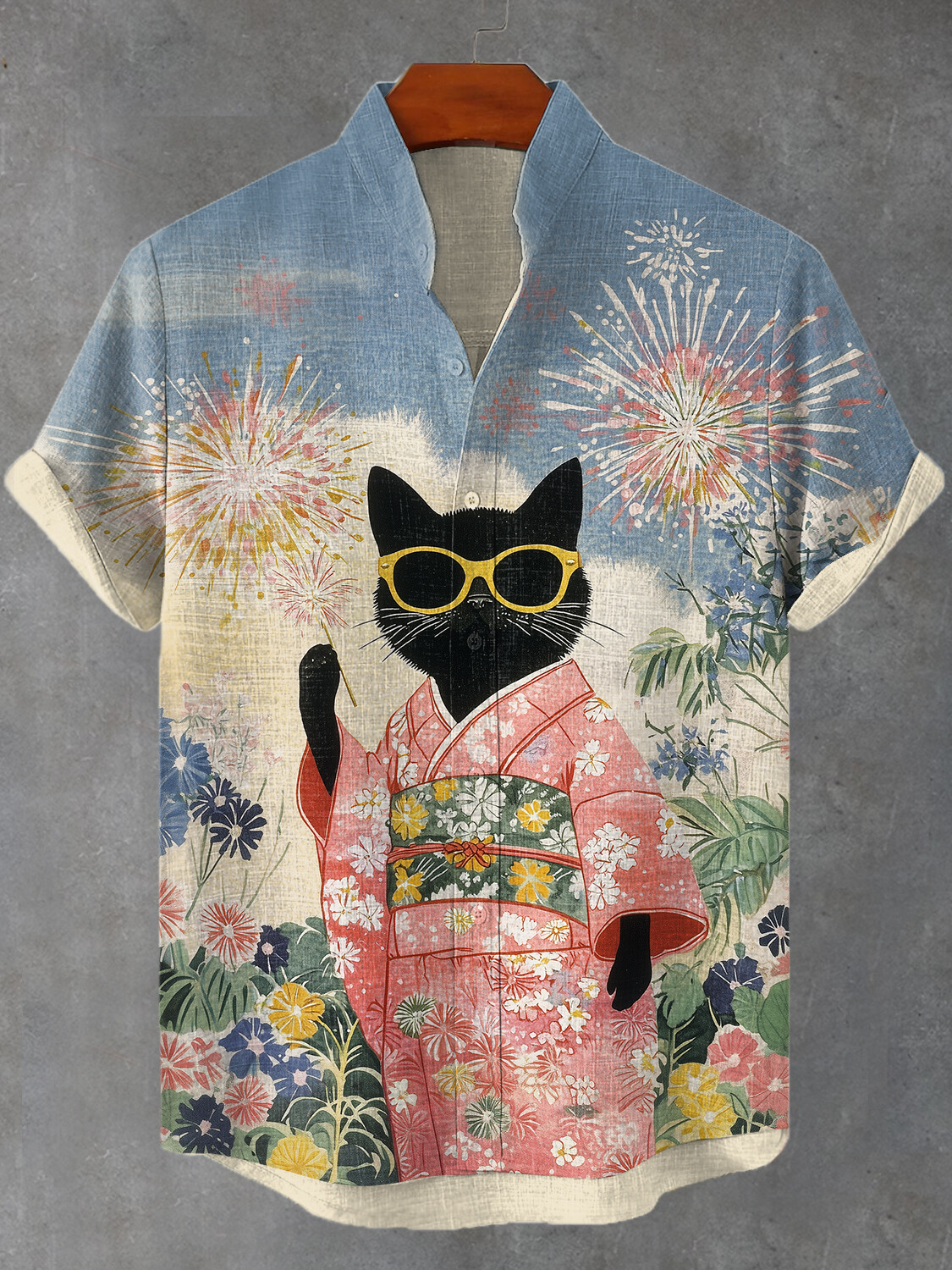 Men's Kimono Black Cat Flowers Fireworks Print Shirt