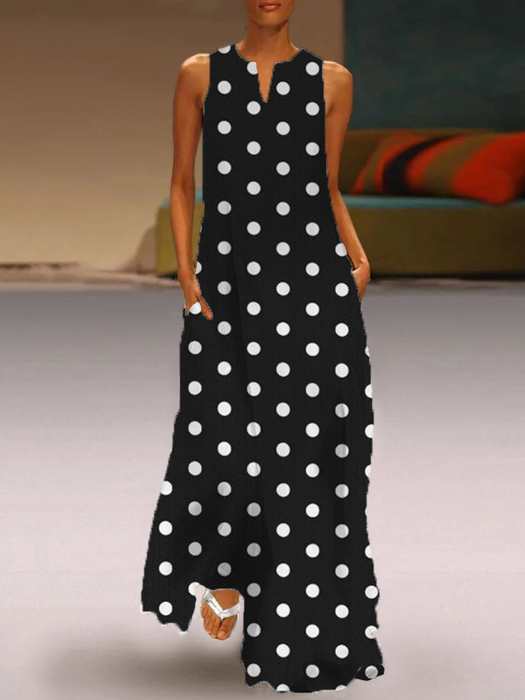 V-neck Casual Sleeveless Polka-dot Floor-length Dress