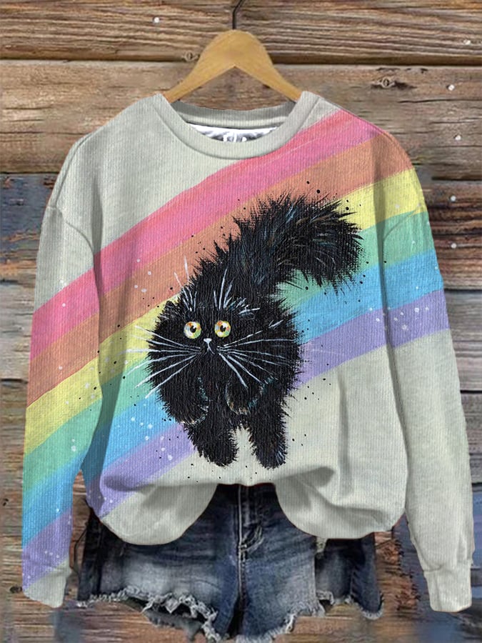 Women's Cute Black Cat And Rainbow Print Casual Sweatshirt