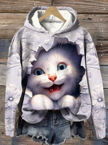Women's Cute Cat Floral Print Long Sleeve Hooded Sweatshirt