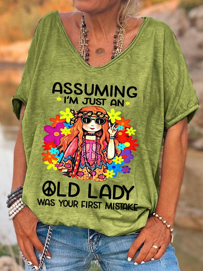🔥Buy 3 Get 10% Off🔥Women's Funny Hippie Assuming I'm Just An Old Lady Was Your First Mistake Casual V-Neck Tee