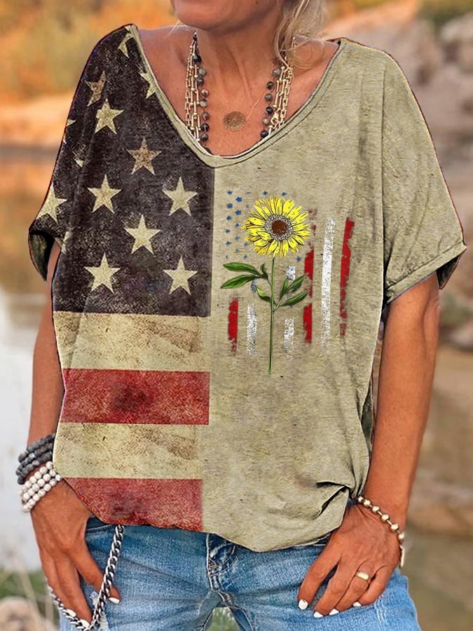 Women's Hippie USA Flag And Sunflower Printed T-Shirt
